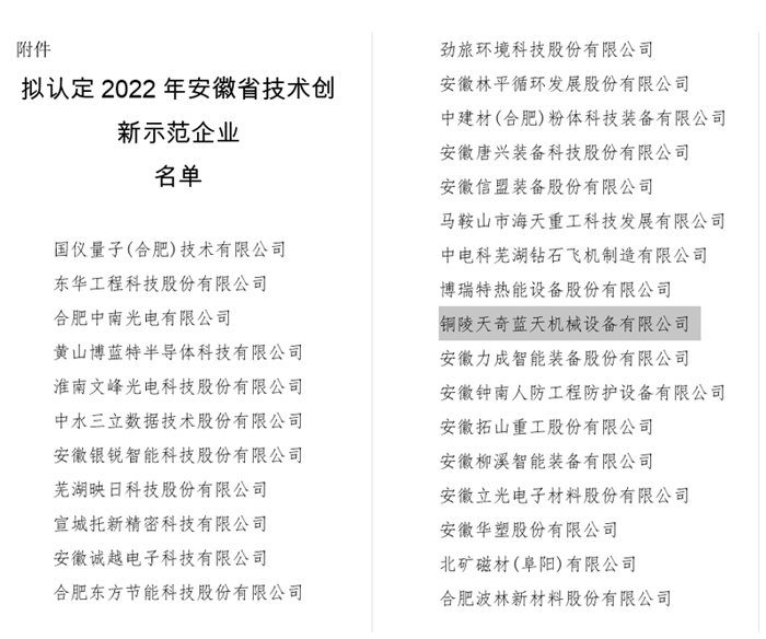 據(jù)悉:在日前安徽省經(jīng)濟(jì)和信息化廳公示的“關(guān)于2022年安徽省技術(shù)創(chuàng)新示范企業(yè)擬認(rèn)定名單”中,銅陵天奇藍(lán)天名列其中。此次榮獲該榮譽(yù),是對(duì)公司前期技術(shù)創(chuàng)新工作的肯定和褒獎(jiǎng)。同時(shí)也將激勵(lì)我們緊盯行業(yè)前沿技術(shù),不斷加大團(tuán)隊(duì)建設(shè)和資金投入以提升公司的核心競(jìng)爭(zhēng)力及市場(chǎng)影響力。促進(jìn)持續(xù)發(fā)展,推動(dòng)科學(xué)技術(shù)進(jìn)步,力爭(zhēng)我司在技術(shù)創(chuàng)新領(lǐng)域取得更大成果。